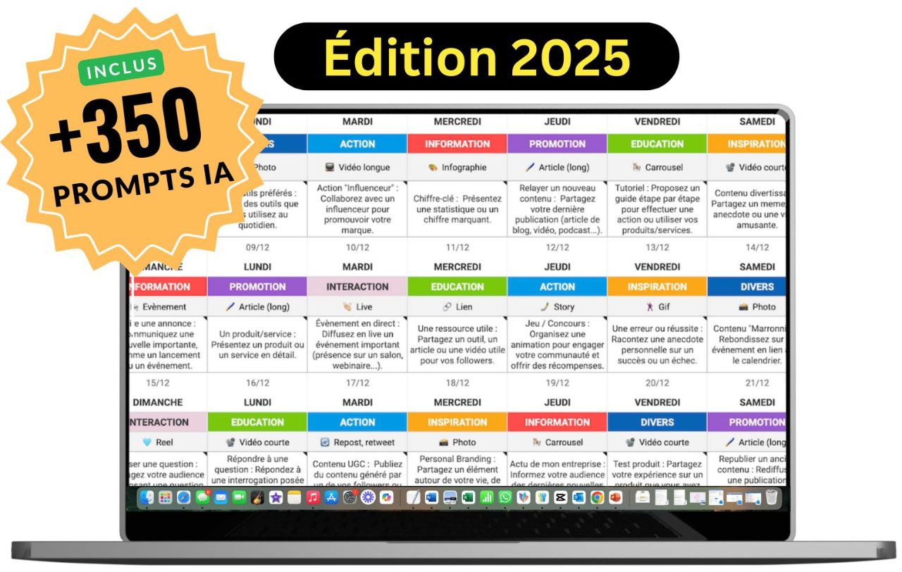 En plus, chaque publication est classée par mois et par thème, ce qui te permet de planifier facilement et d’ajuster chaque idée en quelques secondes.