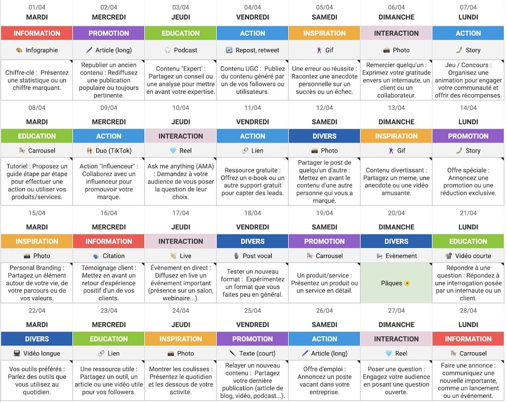 Et chaque idée de publication est pensée pour s’adapter aux différents formats (images, vidéos, carrousels, etc.) afin de maximiser l’impact de tes contenus sur chaque plateforme.