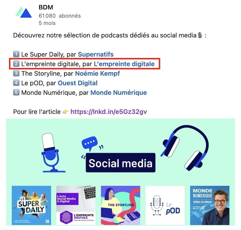 Tu peux me retrouver toutes les semaines dans mon podcast "L'empreinte digitale", qui est classé numéro 2 par le Blog du modérateur dans la catégorie "Social Media" :